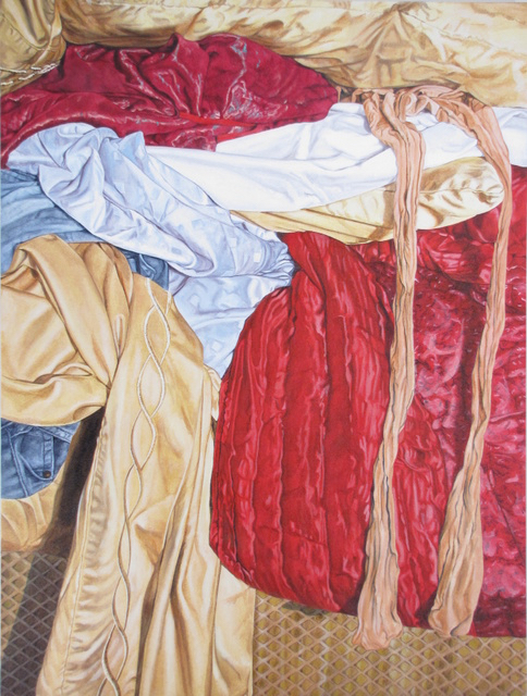 With some exceptions, as the paintings seen in the studio shot reveal, my current and recent work is mostly still life painting, the most abstract of representational painting genres. The subject matter is clothing and bed-clothes, which can be draped, compressed, spread, folded, juxtaposed and mingled, and viewed from a variety of perspectives .