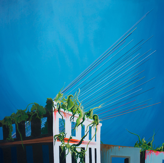 My paintings, drawings and installations center on the general themes of identity and globalization through the tropes of landscape and embroidery. I draw from memory, history, travel, and pop-culture, and employ bright bold colors and patterns to ignite otherwise barren, abstract, and often highly conceptualized landscapes. While these landscapes are unpopulated, their mountains, oceans, plains, and cities often bear the trace of human activity. The embroidered elements allude to the work of the “other,” referencing women and sweatshop workers.