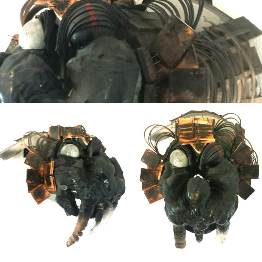 Medium: burned wood, resin, oil, spray paint, drywall, polystyrene foam, brad nails, wood glue